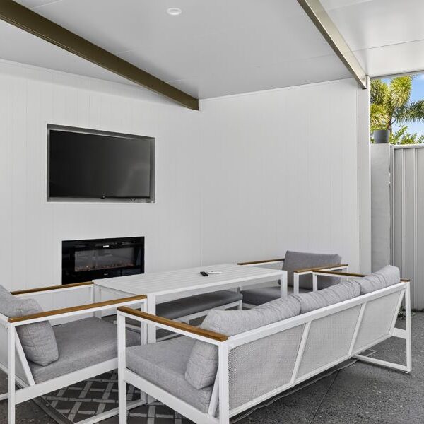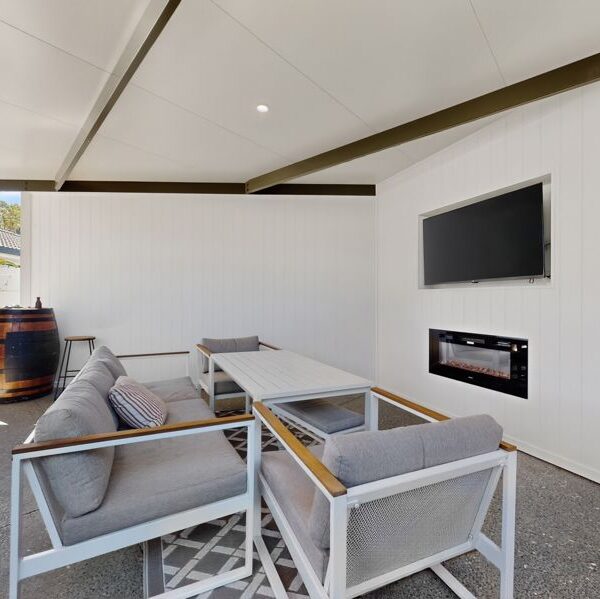 ~Covered outdoor entertaining space with insulated roof, fireplace, ceiling fan, LED lights & TV- perfect for alfresco dining or cozy evenings
